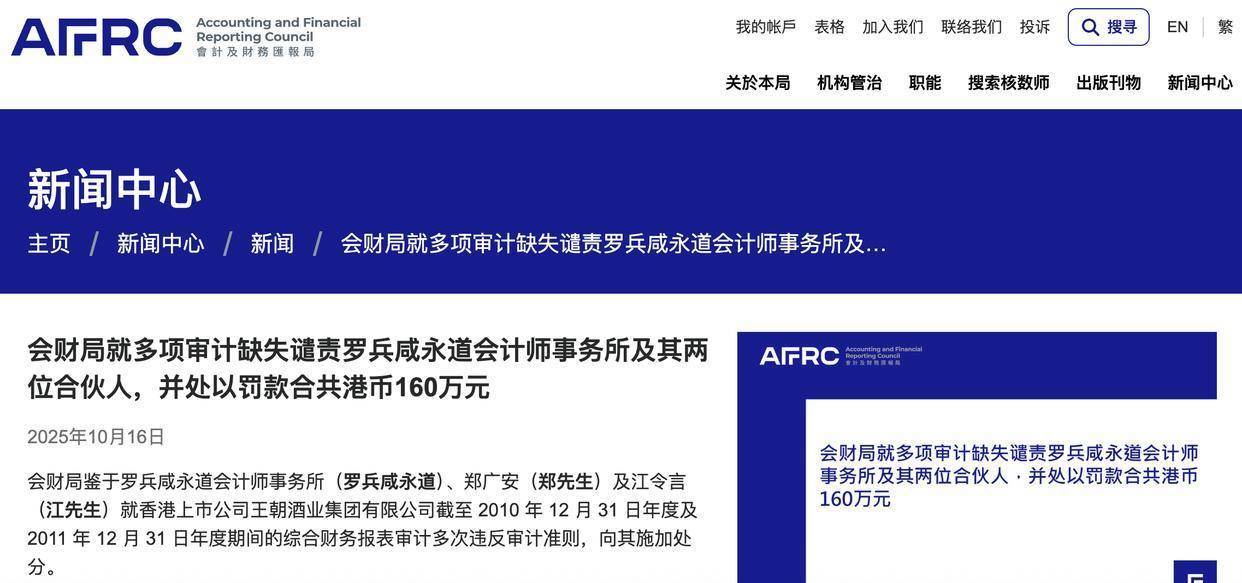 上述公告显示,会财局鉴于罗兵咸永道会计师事务所(即普华永道香港)、郑广安及江令言就香港上市公司王朝酒业集团有限公司截至2010年12月31日年度及2011年12月31日年度期间的综合财务报表审计多次违反审计准则,向其施加处分。